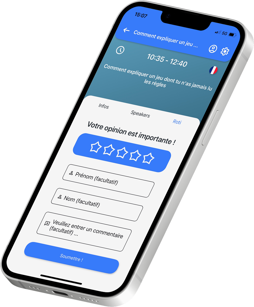 Partagez facilement votre ressenti après chaque session ! Notez les conférences en un clin d’œil et laissez un commentaire si vous le souhaitez. Vos feedbacks sont précieux pour améliorer les prochaines éditions de la Journée Agile.